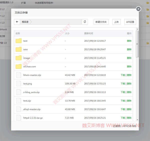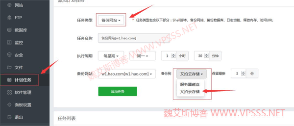 宝塔 linux 面板高度集成又拍云存储,可通过宝塔面板计划任务,将您的网站或者数据库打包备份到又拍云存储空间里,还可以通过宝塔面板又拍云存储插件,在线上传管理内容。魏艾斯博客推荐新手老手都去尝试一下宝塔面板,对于 Linux 真的是极好用的。没用过的了解更多可以点击宝塔面板。