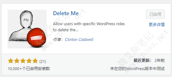 Delete Me插件设计的很易用,删除过程也很简捷,删除会把账号、发布的文章都删除。这个插件虽然有2年未更新了,不过在 WordPress6.0 版本还是可以用的,如果你的网站有多用户注册,并且有一定规模了, 就可以试试这个插件。