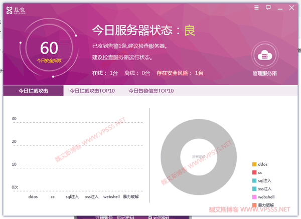 数据报告界面如下,可以看到我用来评测的这个服务器有一条安全风险警告,建议检查服务器。下面看到今日拦截攻击的数据和告警信息数据。