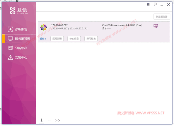 点击右侧的“管理服务器”进入管理界面如下。看到已经登录的服务器 IP 地址和系统类型,可以远程管理和新增服务器。