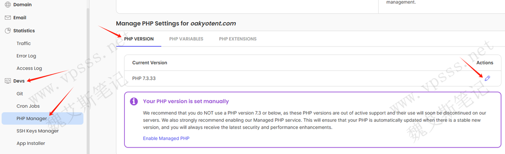 这个功能位于 Site tools>Devs>PHP Manager>PHP VERSION,看到默认是 PHP8.3最新版本,然后老魏点击下图右侧的笔头,手动修改成最旧的 PHP7.3.33版本,保存。相关知识请移步Siteground托管PHP服务与手动PHP版本管理的区别及选择查看。