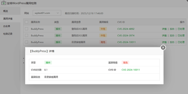 如下图所示,会详细提示插件漏洞的情况和登记,方便站长及时补上漏洞,提高站点安全性。