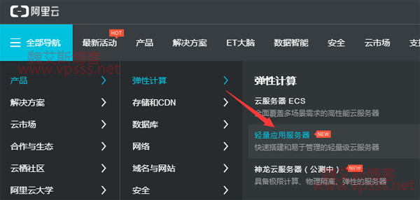 1、领券后(点我领券,阿里云 100+产品抵扣 50 元起)从阿里云首页导航栏进入轻量应用服务器。选择立即购买