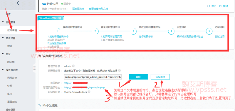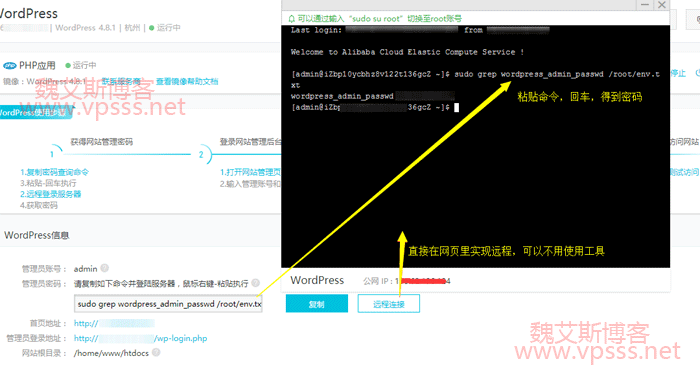 打开远程连接后粘贴命令,回车拿到 wordPress 管理密码。