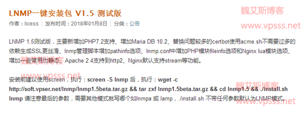 2018 年 1 月初军哥发布了lnmp1.5 测试版。LNMP 的大名在国内站长圈内可谓无人不知无人不晓,太多人都在使用军哥 lnmp 做生产环境了,包括魏艾斯博客在内,希望军哥能够一直把这个有益于大家的项目做下去。