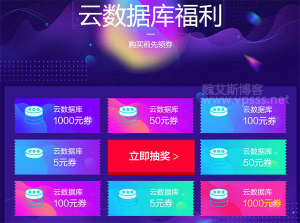 阿里云数据库最近搞活动,购买之前先抽奖,奖品是阿里云数据库 5 元券,50 元券,100 元券和 1000 元券。先领红包后下单,数量有限先到先得。