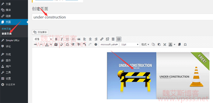 在 wordpress 后台新建一个页面。是页面不是文章,命名为”under construction”,上传刚才那张图片作为整个页面的内容。