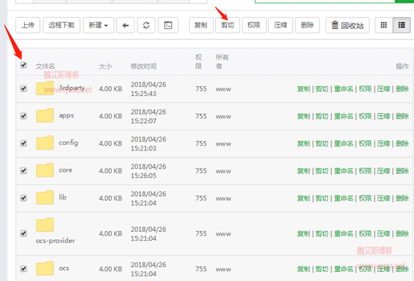 五、刷新一下当前页面就看到下载后的 nextcloud 安装包了,在名字后面点击解压,会解压缩到 nextcloud 文件夹。进入这个文件夹,全选,剪切,回到网站根目录,粘贴所有(后台右上角),这样就把 nextcloud 的安装文件放到网站根目录了。