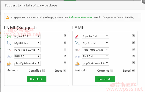 进入 aaPanel 后台,看到了熟悉的 lnmp/lamp 安装界面,按照习惯老魏会选择 lnmp(不含 pure-ftpd)快速安装,经常使用宝塔面板的朋友一看就明白应该如何选择了,点击下面的“one-click”开始安装。过程需要等待 30 分钟左右,具体时间长短看你 VPS 硬件配置如何。
