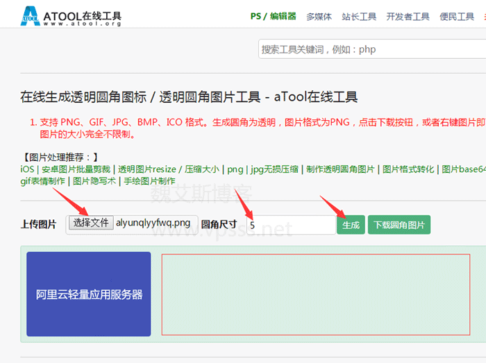 这种在线工具对于类似魏艾斯博客的使用要求已经足够好用了,以上两款在线工具的好处是不需要注册、登录的麻烦,上传和生成速度也挺快,生成的圆角图片也让人满意。