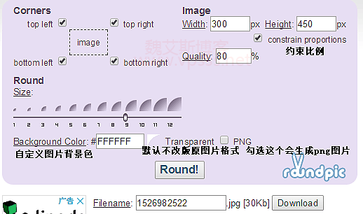 再为上传的图片选择哪几个角要圆角化,选择不同程度的圆角化,自定义圆角的背景颜色,以及对图片的高度和宽度、约束比例、图片质量、选择生成 png 格式等等。