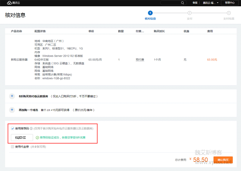 登录腾讯云官网——选择云产品——立即购买——勾选使用推荐码——输入 6 位推荐码:6QKYGZ——立享 9 折优惠