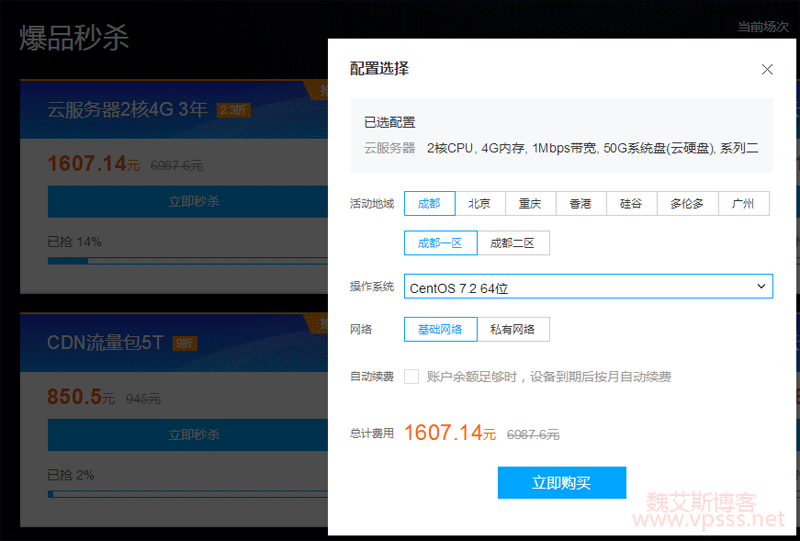 眼下天气也热了,网上 VPS 销售活动也越来越多,腾讯云正在年中大促,之前魏艾斯博客对腾讯云年中大促-热销云产品年付 3 折起做过简单的介绍,就在刚才看到腾讯云的秒杀活动,又推出了性价比极高的一款配置:2 核 CPU、4GB 内存、1Mbps 带宽独享不限流量,秒杀价格 1607.14 元/3 年,适合建站、项目使用,同时提供香港等免备案海外节点,请看下面的详细介绍。