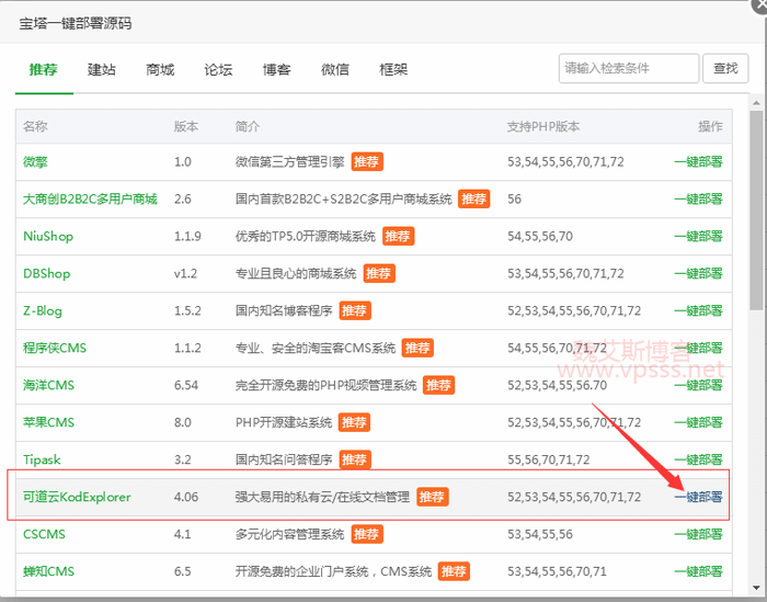 进入宝塔面板后台的“软件管理”,右侧找到“宝塔一键部署源码”,点击最右侧的“设置”,会看到下图中的“可道云 KodExplorer”,点击右侧的“一键部署”。