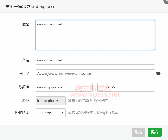 在弹窗中输入域名、根目录名、数据库账号密码和 php 版本,创建可道云的网站。