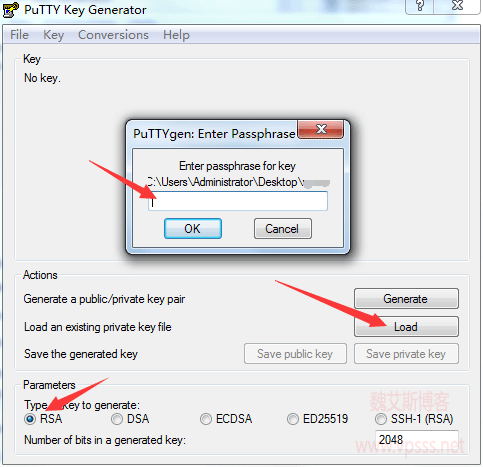 2、点击 load,弹窗下面的文件名选择 All Files,找到上次用 Xshell 生成的私钥(也就是没有扩展名的那个文件),这时候弹窗有一段英文提示(这里就不截图了),意思是需要转换成 PuTTY 的格式,点击确定即可自动转换。