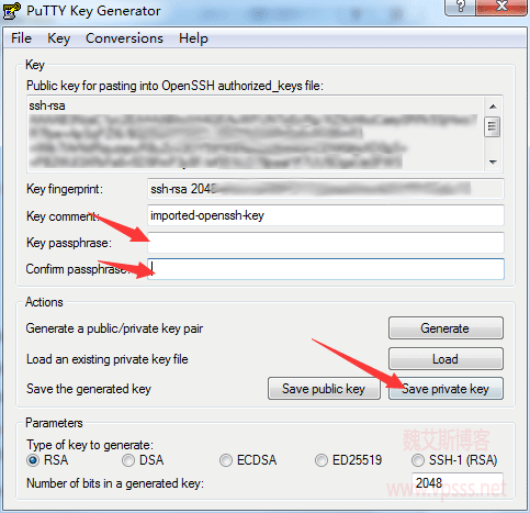 3、可以看到已经生成了 PuTTY 格式的私钥,点击 Save private key(如果密码留空会弹窗让你再确认一次,点击确定即可),给 PuTTY 私钥起个名字并保存下来。建议同时保存到本地电脑和邮箱各一份。