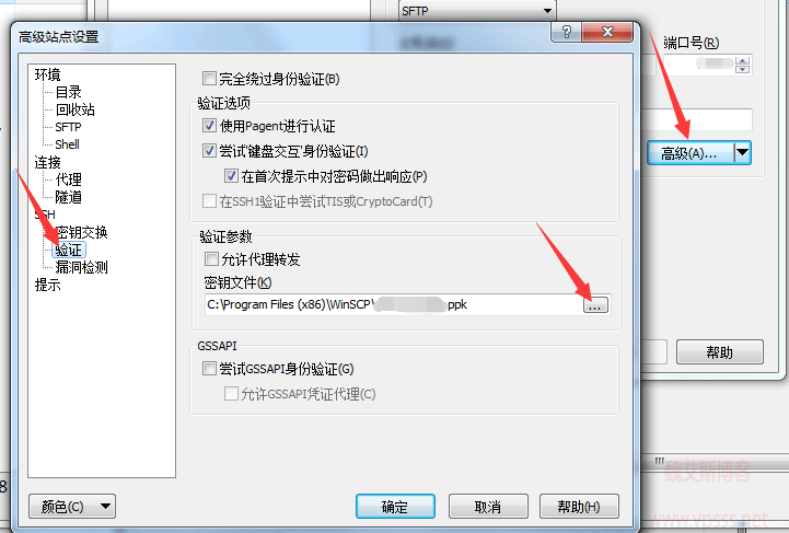 打开 winscp 的高级站点设置(也可以从建立好的站点>>编辑>>高级进入),找到 SSH 下面的验证,右侧的验证参数,点击三个横点把上面生成的私钥文件导入进来,确定。