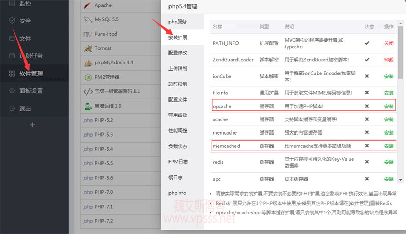 个人博客的 php 缓存扩展推荐使用 Opcache 脚本缓存和 Memcached 内容缓存。在软件管理>>你使用的 php 版本最右侧点击“设置”,进入安装扩展,右侧点击这两个扩展后面的“安装”,再确认一次,很快搞定。