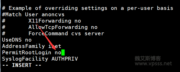 输入 a 进入编辑状态,方向键定位后修改,把 PermitRootLogin 后面的 yes 改成 no 就可以了,如下图所示是改完后的结果。