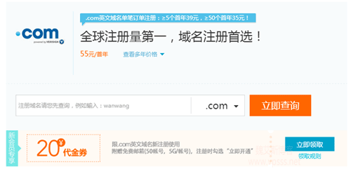 2. 20 元域名代金券仅适用于.com 英文域名注册使用,领券后注册.com 英文域名首年仅需 35 元;