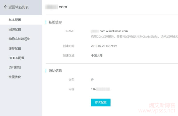 以上是 DNS 解析这块的操作,这样还没完事儿,还需要在 CDN 加速后台设置一下,把服务器域名添加到源站 IP 里面去,如下图所示。