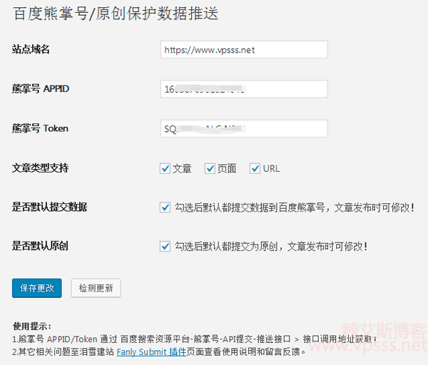 Fanly Submit 需要添加熊掌号 APPID 和熊掌号 Token,就能够正常连接到熊掌号并自动推送文章了,简单的不得了。看下图填写空格,勾选全部选项即可。不过要注意一点,就是说你要知道自己的文章原创程度有多少,如果确实原创的少就别勾选这个选项,熊掌号会自行判断你文章的原创度,如果总是提交一些不达标的伪原创文章,会被降低提交数量的。