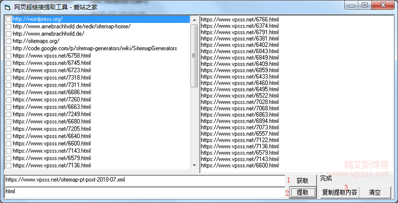 大家看下图的“获取”按钮,在前面的空白处填入每个月的 xml 网址(googlesitemap 生成的 xml 文件中能找到),点击获取按钮,看到上面左侧获取到的网址(包含很多不需要的网址),在“提取”按钮前面输入 html(因为只需要 html 结尾的网址),点击“提取”按钮,上面右侧就是提取出来的 html 网址,最后点击“复制提取内容”按钮,粘贴到 txt 文本文档里面。