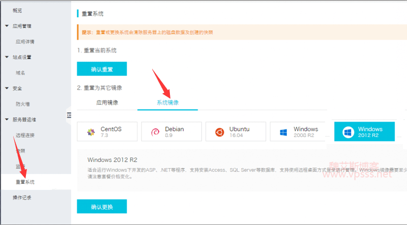 2、更换系统要进入阿里云轻量应用服务器管理控制台,左侧找到并点击“重置系统”>>系统镜像选择 win2012,点击确定更改。