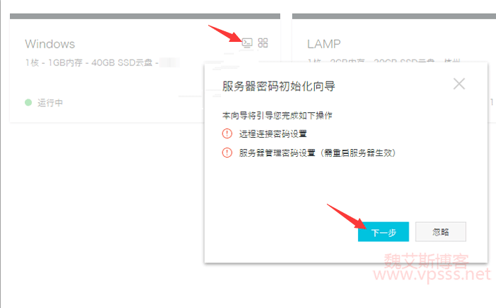 等系统创建成功后,在管理控制台中点击远程连接(小电脑图标),设置远程桌面连接密码和服务器管理密码(administrator 的密码)。