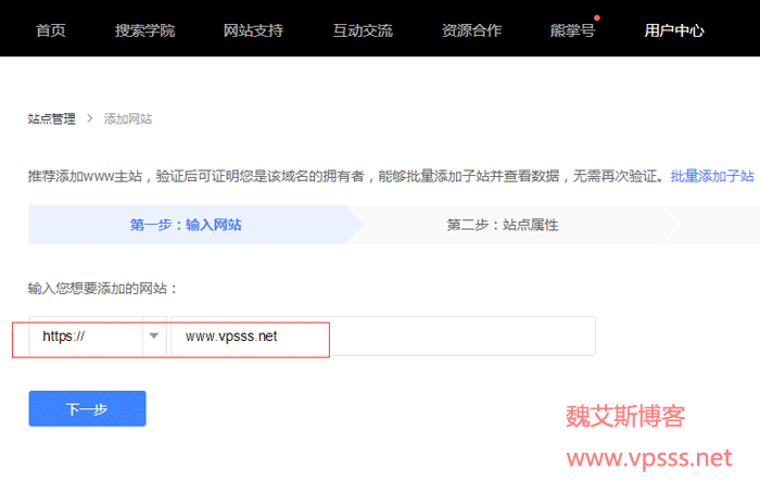 1、百度账号登陆后找到“用户中心”>>“站点管理”,点击“添加网站”。输入域名和协议头,点击下一步。