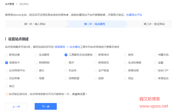 2、设置站点领域,可以多选,不过站点认证成功后,领域信息 30 天内只能改一次,所以要谨慎点选择。