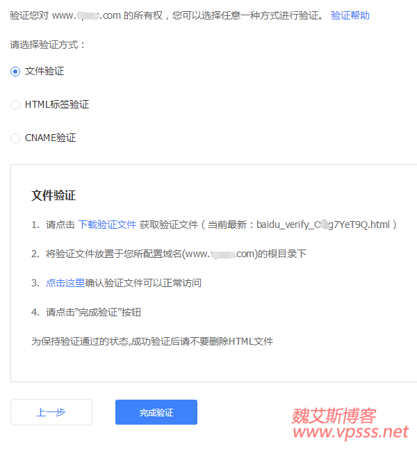 3、需要验证你对域名的所有权,百度提供三种验证方式:文件验证、HTML 标签验证和 CNAME 验证。