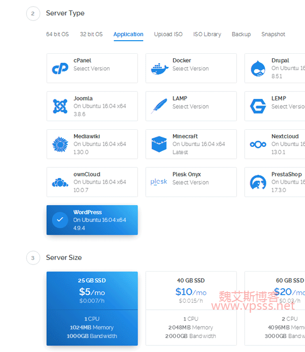 2、在 Vultr 后台点击右侧那个+,打开页面后主要说一下 Servier Type。这里面点击 Apptication 后最下面看到 WordPress。要注意这时候 Server Size 起步是 1G 内存了,这里还是要为 Vultr 点赞的,本身 WordPress 对内存消耗较大,512M 内存真不够干啥的还会卡顿。