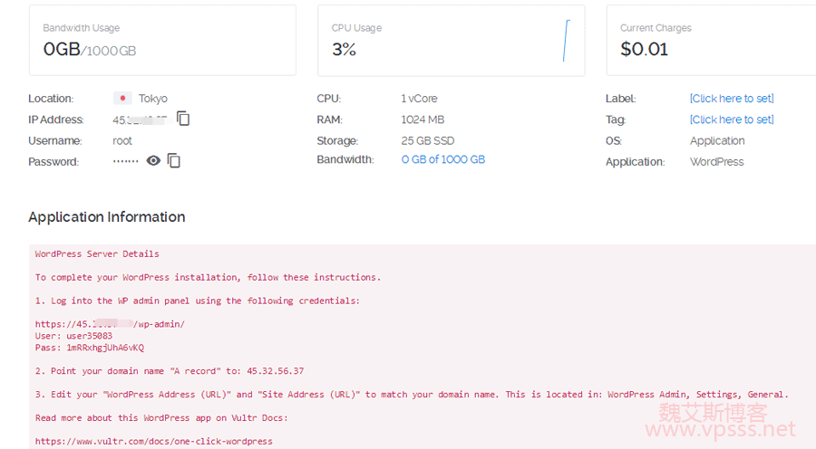 3、点击 manager 进入主机管理界面,看到如下界面。1 核 1G 内存 25G SSD 硬盘配置,提供 1000GB 流量,选用了东京机房,然后下面红字部分的网址、user、pass 是 wordpress 后台管理界面地址、管理员账号和密码。
