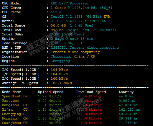 腾讯云 AMD CPU 云服务器自从 2018 年夏天推出后销售火爆,记得那时候魏艾斯博客发了文章腾讯云 AMD CPU 云服务器全国首推,当时 600 元/3 年没想到现在涨价了,居然 631.8 元/3 年!!!虽然涨的不多但是当初 600 元没下手的朋友们是不是有点遗憾呢?一般云产品会越来越便宜,但是腾讯云 AMD CPU 服务器不是这样子的。趁着前几天优惠活动老魏上手了一台腾讯云 AMD 服务器重庆节点服务器,本文是给感兴趣的朋友介绍一下腾讯云 AMD CPU 云服务器重庆主机性能及评测。